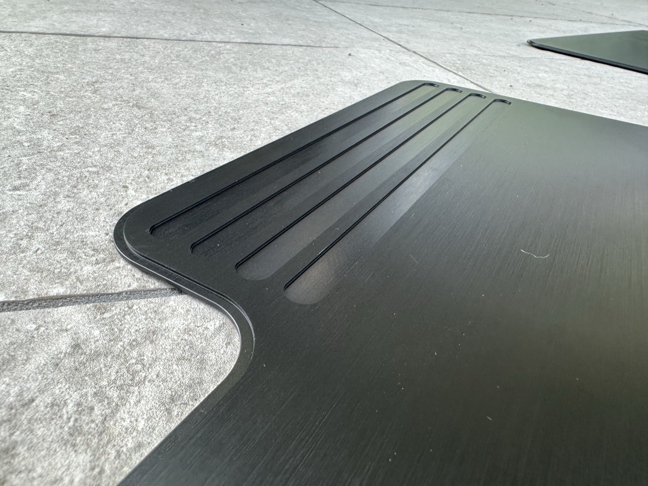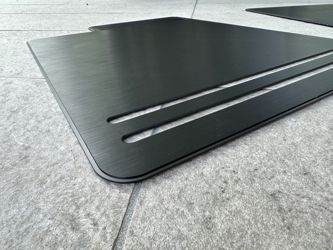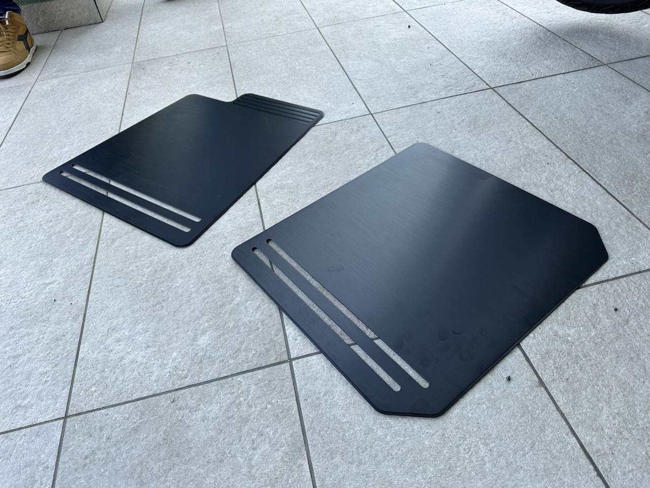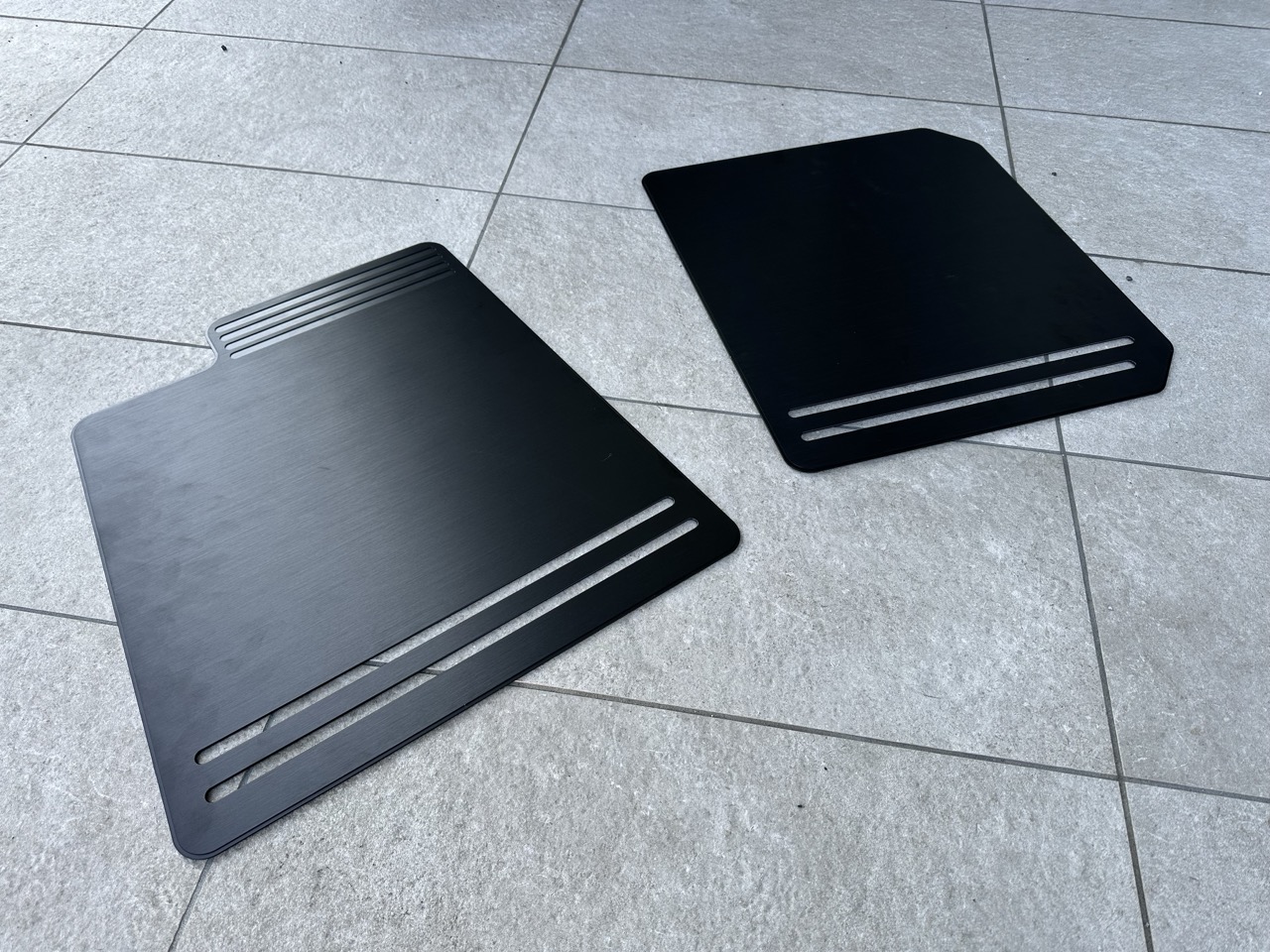 High quality CNC-machined replacement car mats, with a black anodized finish, with holes at the bottom and foot rests on the driving position.