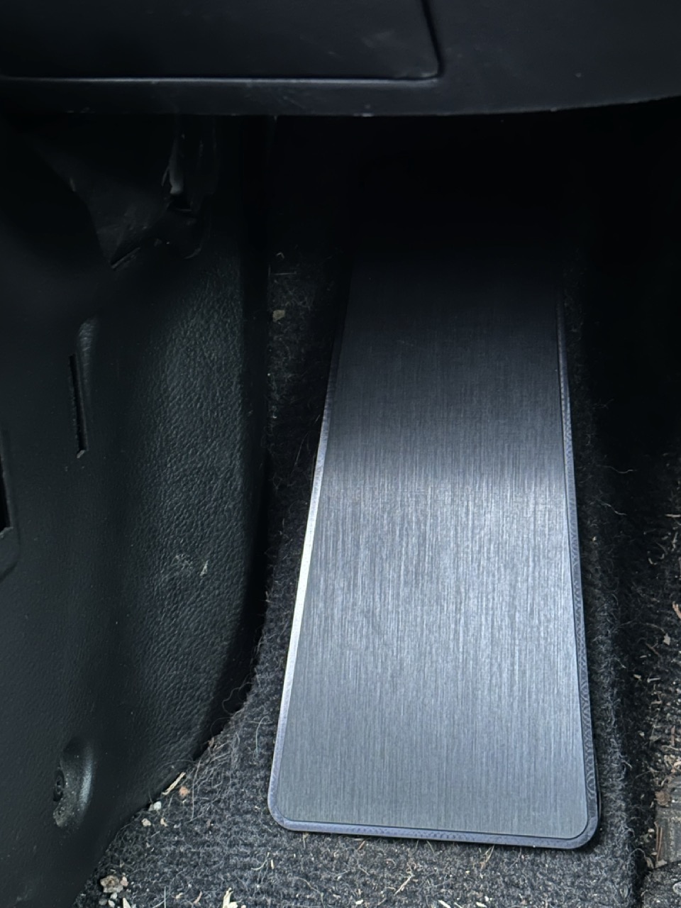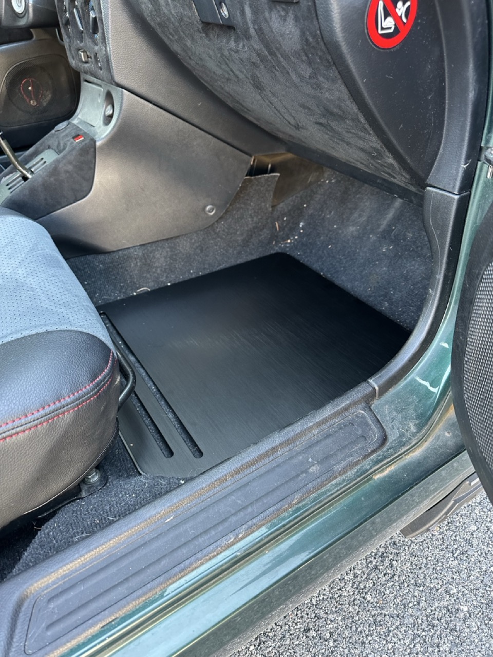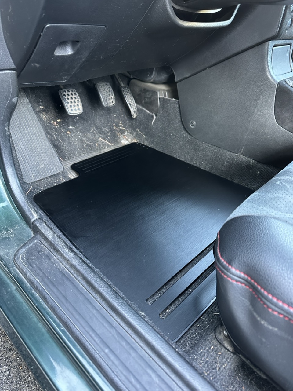 High quality CNC-machined replacement car mats, with a black anodized finish, with holes at the bottom and foot rests on the driving position.
